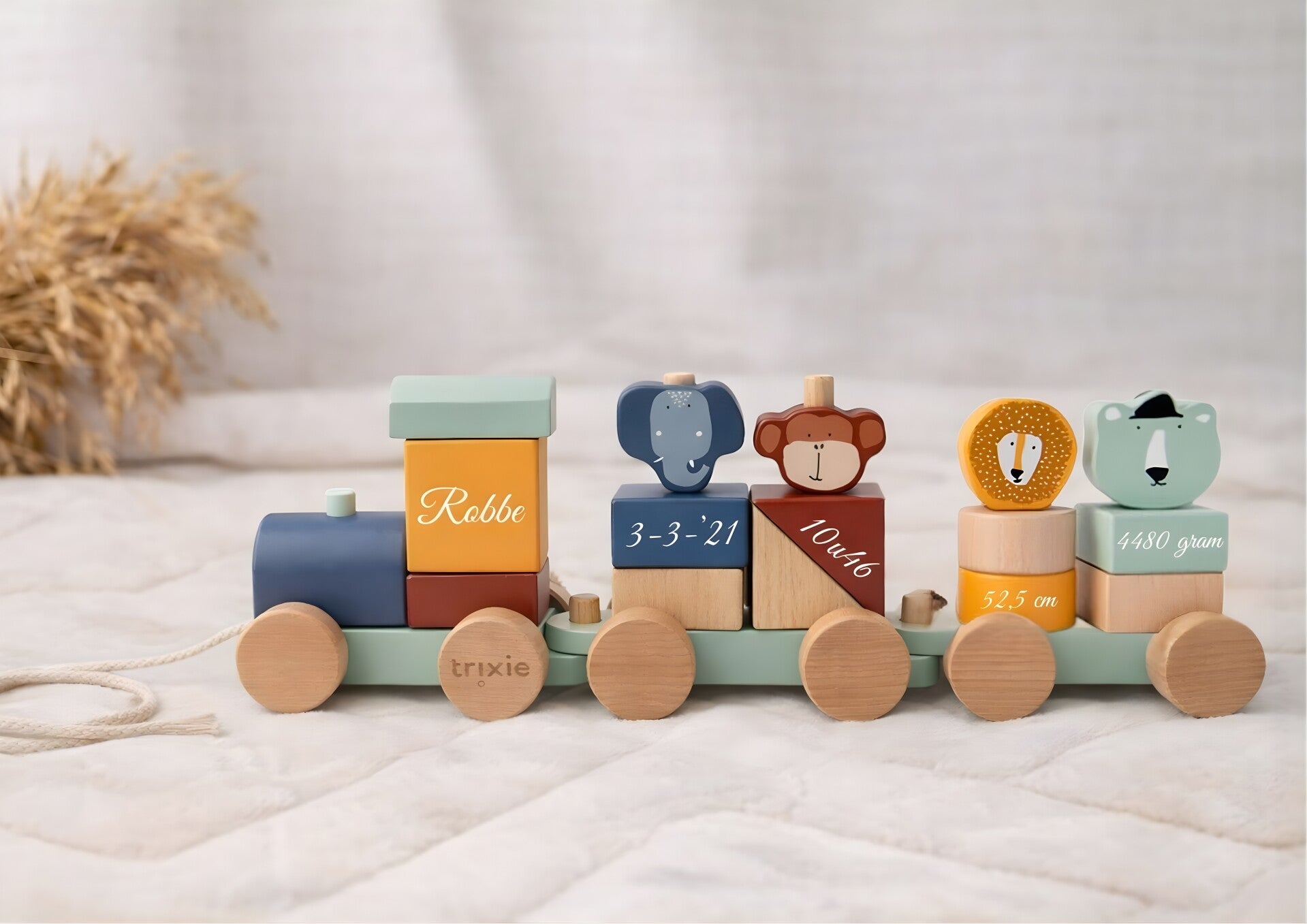 Spring op de trein met onze Trixie dierenvrienden! Met alle verschillende blokken in verschillende kleuren, kun je je eigen wagons maken. Gebruik het touwtje aan de voorkant om je trein mee te trekken op de leukste avonturen! De trein en al zijn elementen zijn gemaakt van 100% FSC ® gecertificeerd hout. Alle verven zijn op waterbasis en veilig voor baby's.